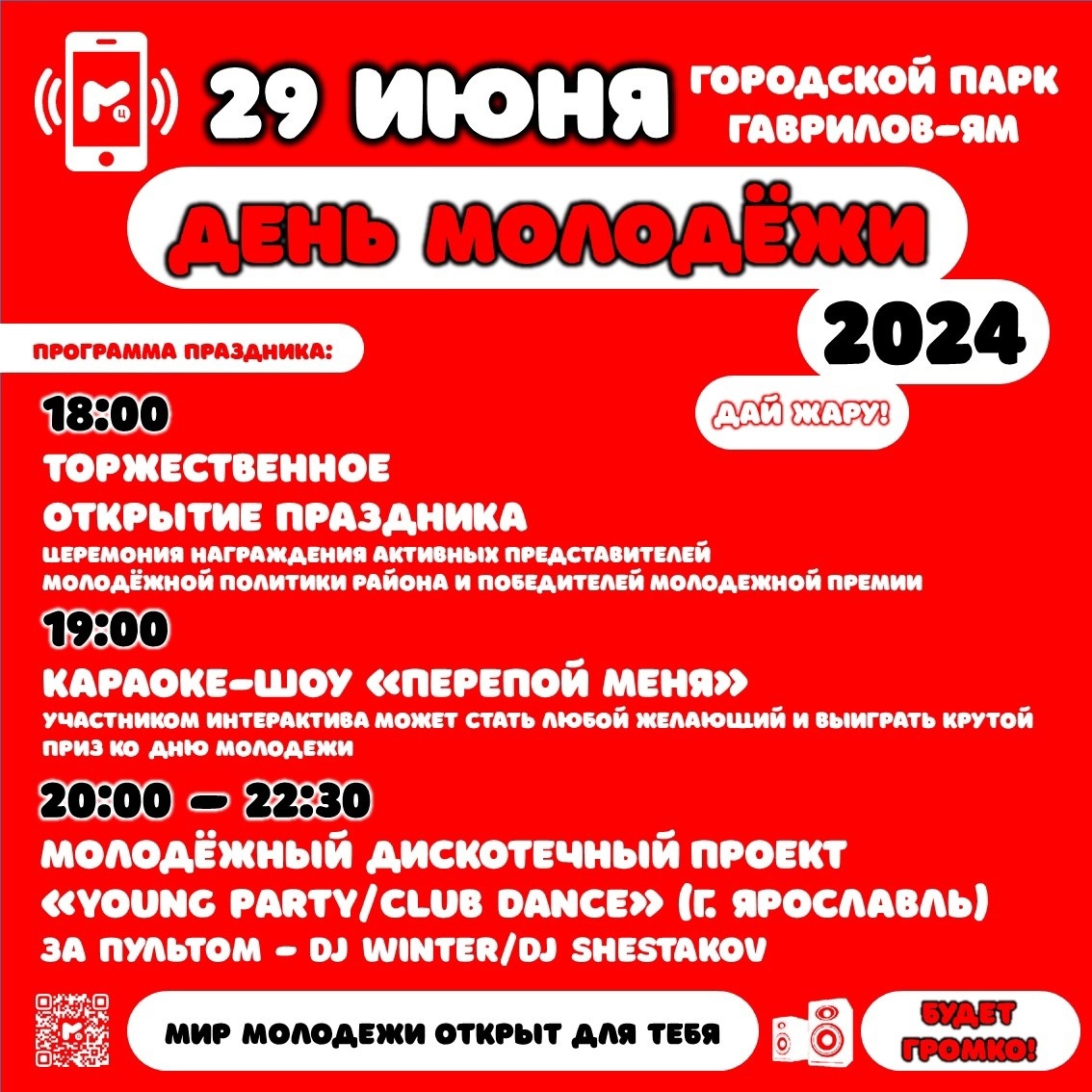 КультураПриглашаем жителей и гостей района на праздник юности – День молодежи, который состоится 29 ИЮНЯ с 18:00 до 22:30 на танцевальной площадке Городского Парка.