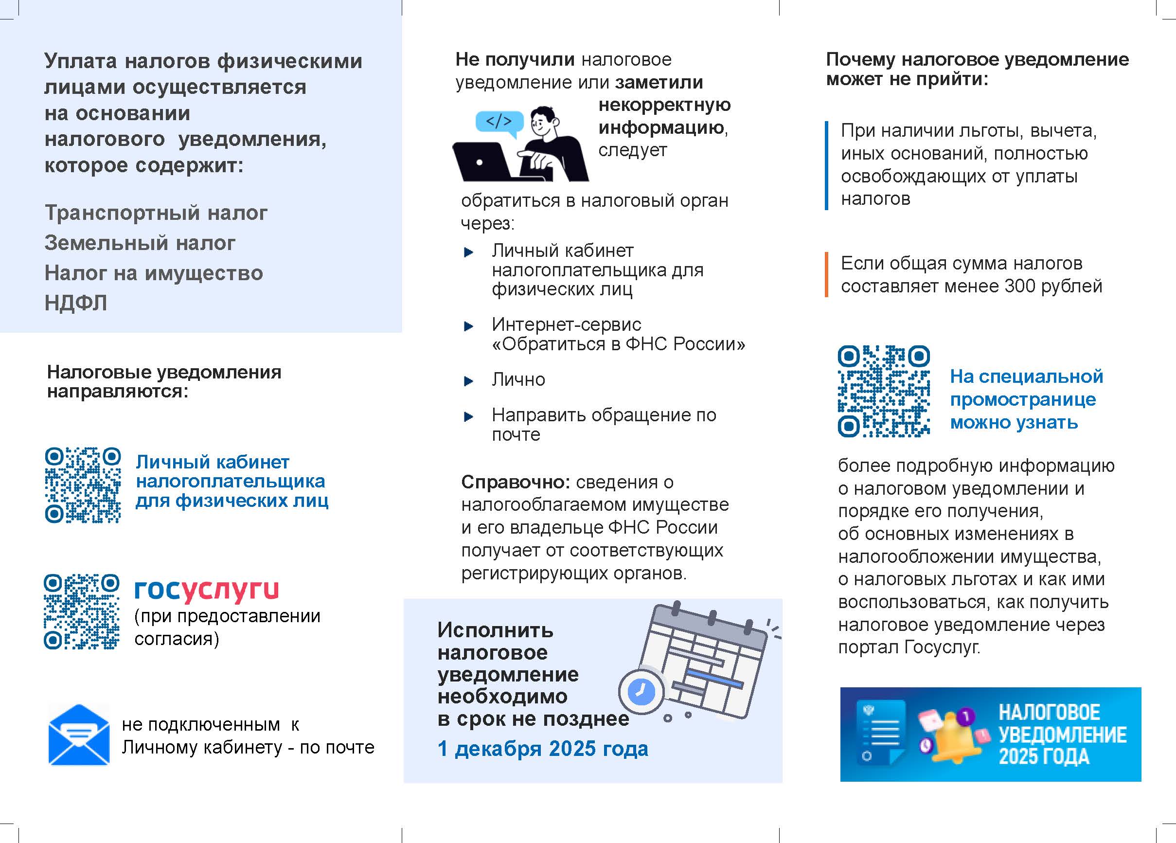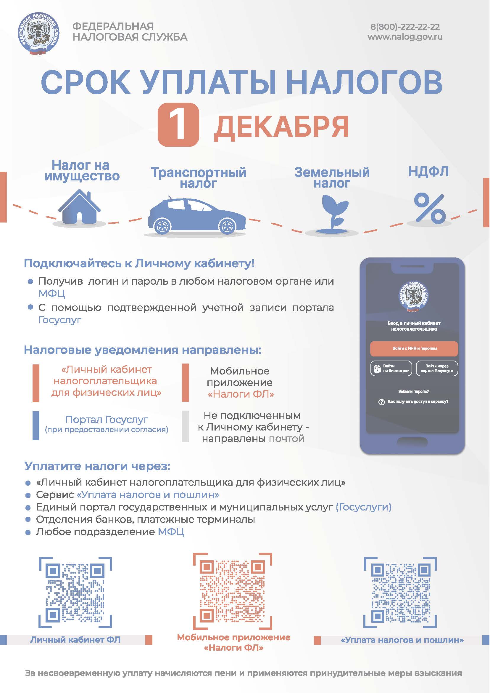 Федеральная налоговая службаНапоминаем, что уплатить имущественные налоги за 2024 год необходимо не позднее 1 декабря 2025 года. К имущественным налогам относятся транспортный, земельный, а также налог на имущество физических лиц. Налоги уплачиваются на основании уведомления, которое рассылается не позднее 30 дней до наступления срока уплаты.